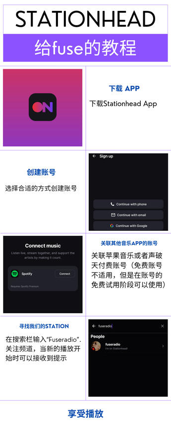 需下载Stationhead App, 且拥有一个苹果音乐或者声破天的账户- 当每名用户关联一个账户时,产生一个有效播放。例如,如果有10名听众,算作歌曲有十次播放量(十个注册用户=10次播放)每次播放都有效!- 如果你时间不富裕,可以链接指定的Station,在做其他事情的同时让其自行播放。主持人会负责播放曲目和切换列表- 你可以和其他Fuse交流。通过聊天功能你可以和其他听众对话,甚至点播歌曲- 播放量会计入到Billboard公告牌榜单, 目前很多打歌节目也会将苹果音乐和声破天榜单作为海外平台播放成绩计入积分