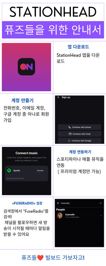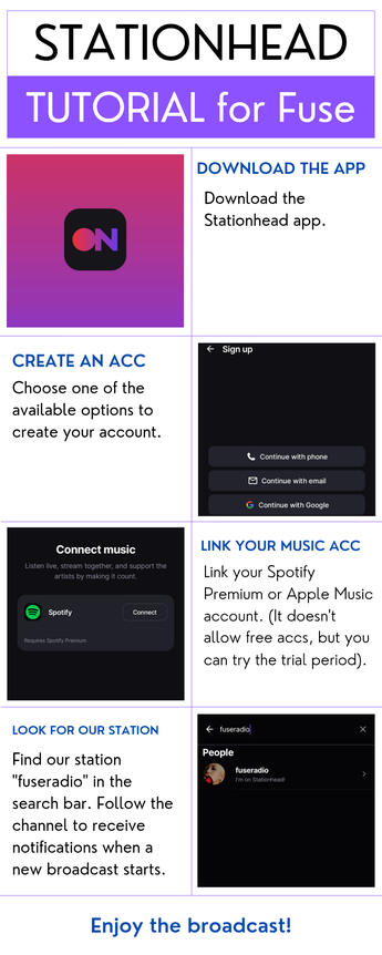 You need to install the Stationhead app and have an Apple Music or Spotify Premium account.- If each listener connects with their acc, each stream is counted. For example, if there are 10 listeners, that'a 10 listens for the song (10 listeners with their acc = 10 streams) EACH stream counts!- If you don't have much time, you can connect to the indicated station and leave it playing while you do other things. The host is in charge of play the songs and changing playlists.- You can interact with other Fuses! Through the chat you can talk to other listeners and even request songs.- The streams counts for Billboard, and currently several Music Shows take into account Spotify and Apple Music as international music platforms for the score counting.